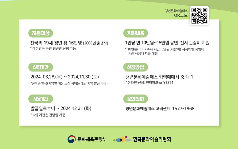 문화체육관광부는 한국문화예술위원회와 함께 3월 28일 오전 10시부터 협력예매처인 인터파크와 예스 24를 통해 ‘청년 문화예술패스’ 신청을 받는다고 27일 밝혔습니다. 올해 처음 시행하는 ‘청년 문화예술패스’는 소득과 관계없이 국내에 거주하는 2005년생 대한민국 청년이라면 누구나 신청할 수 있는 이용권입니다.