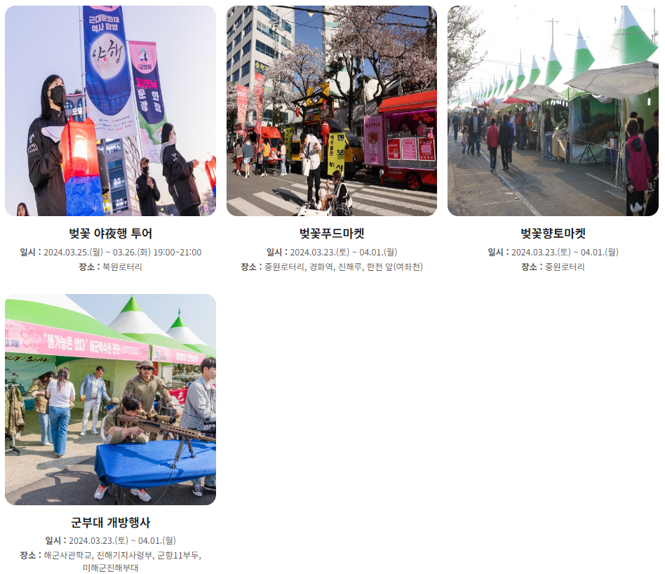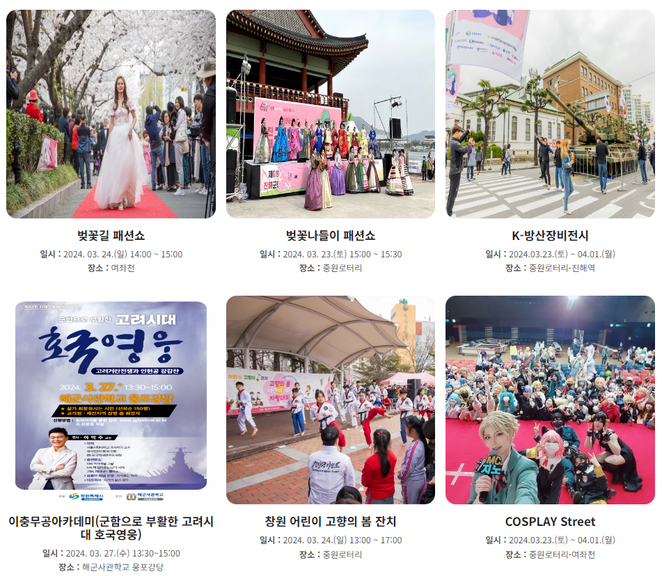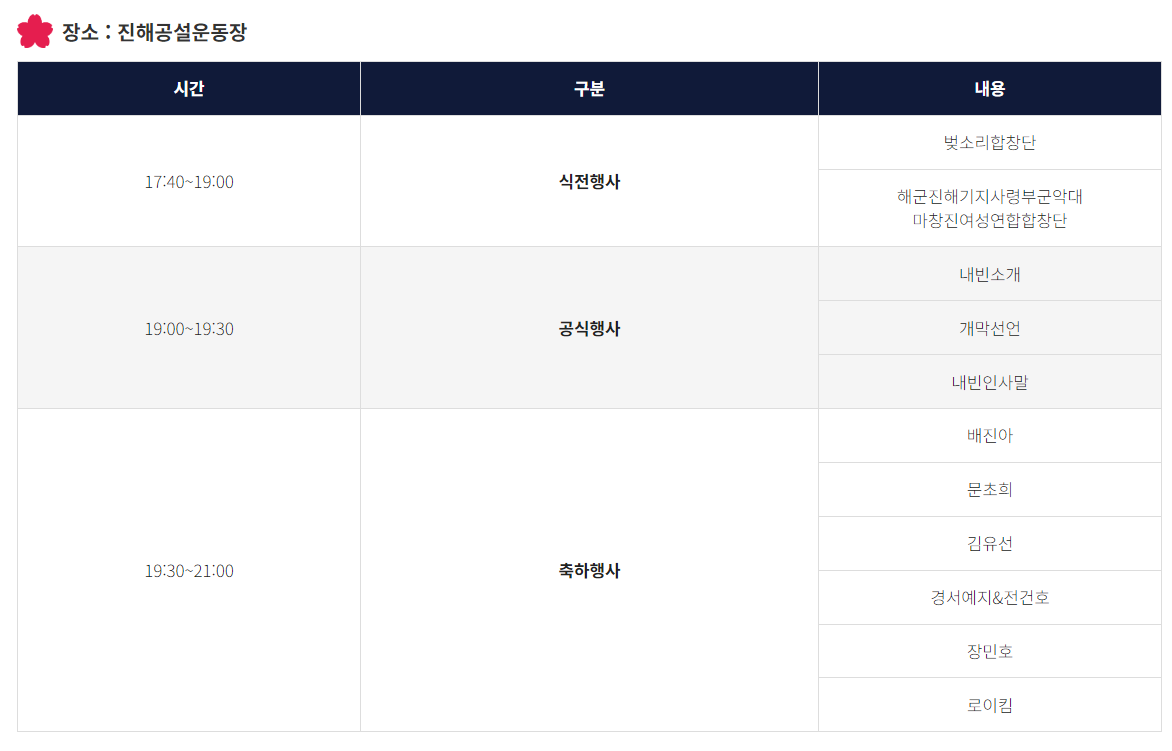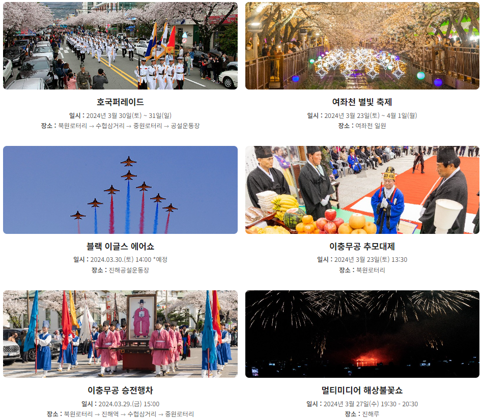 진해군항제는 우리나라에서 가장 유명한 벚꽃 축제입니다. 2024년 3.23일(토)부터 4.1일(월)까지 진행됩니다.